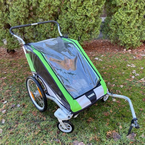 Cykelvagn för barn i blå textil med svart och gråa detaljer. Vagnen har plats för två barn med individuella 5-punktsbälten. Utrustad med genomskinligt regn- och vindskydd framtill, samt nätpanel för ventilation. Stora hjul med reflexer ger bättre synlighet. Fästanordning för cykel med dragstång framtill. Passar för transport av barn vid cykelturer på väg och cykelbana.