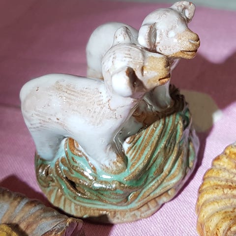 Dekorationsfigurer föreställande ett får och en gris i keramik. Båda figurerna är huvudsakligen vita med något mörkare nyanser nedtill. Fåret är ca 14 cm högt.
