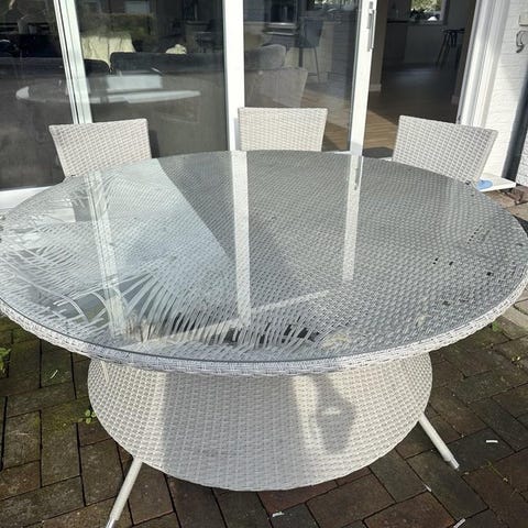 Matgruppen har stått utomhus under vintern. Finns lite små repor på bordet och en stol är lite sliten i ryggstödet (bild på detta finns i annonsen).
