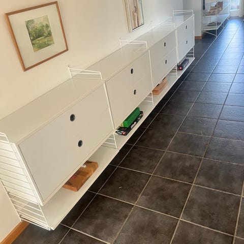 String hyllsystem designat av Nils Strinning med två lådmoduler i vitt. Systemet består av sidogavlar, två lådsektioner med vardera två lådor samt öppna hyllplan nederst. Passar för förvaring i exempelvis hall, vardagsrum eller kontor. Vit färg och nätgavlar ger ett öppet och luftigt uttryck och gör det enkelt att kombinera med annan inredning i samma serie.