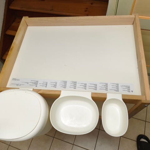 IKEA skötbord 72x53 i trä med vit skivyta. Skötbordet har en öppen hylla undertill för förvaring av blöjor, kläder eller andra tillbehör. På ena sidan finns flera upphängda plastbehållare i olika storlekar för praktisk sortering av småsaker. Passar för skötsel av spädbarn och småbarn i hemmet. Designen är enkel med rak träram och plan skötyta med upphöjd kant runtom för att hålla skötunderlag på plats.