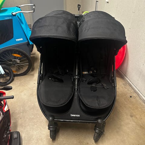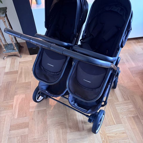 Väldigt smidig dubbelvagn som vi varit mycket nöjda med. Sparsamt använd, en liten fläck på ena suffletten och några ritmärken på ena bågen annars i fint skick utan anmärkningar. Nästan fullt liggläge och stora suffletter. Rullar lätt, mycket förvaringsplats under. Lagom stora hjul som funkar bra både i stan och på tex grusväg.