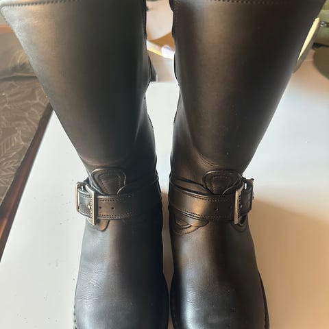 Harley Davidson original . Storlek 9 Motorcykelstövlar i svart läder. Stövlarna har hög skaftmodell med quiltad vaddering baktill och dekorativt spänne över foten. De är försedda med förstärkt tå- och hälparti samt kraftig sula anpassad för motorcykelkörning. Passar som skyddande och tåliga stövlar vid körning eller annan användning där stabila läderstövlar behövs.