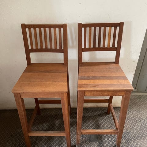 Barstolar med klädd sits i massiv ek. Sitthöjd 63 cm.