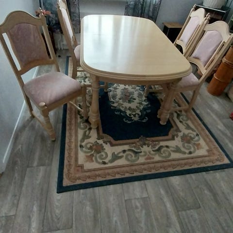 Lite använd matsalsmöbel där bordet är flexibelt med 3 iläggsskivor a 30 cm. Stolar (åtta st) ingår i priset, två med armstöd.