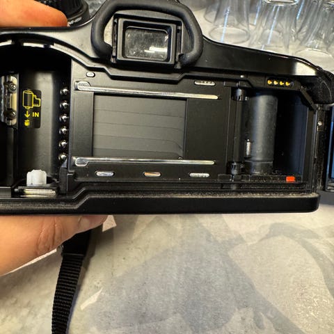 Minolta analog systemkamera med tillhörande objektiv och extern blixt. Kamerahuset är en klassisk 35 mm spegelreflexkamera för analog film. I setet ingår minst ett normalobjektiv monterat på kameran samt ett teleobjektiv. Det finns även en separat blixtenhet och ytterligare ett objektiv eller filter. Utrustningen lämpar sig för analog fotografering med utbytbara objektiv och manuell inställning av exponering, bländare och fokus.