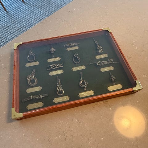 Tavla med över 50 olika knopar monterade på blå bakgrund. Knoparna är gjorda i vitt rep och är namngivna med små skyltar. Tavlan är inramad i en mahognyram med plastglas och har en överliggande mässingsfärgad list med belysning, som är fäst på baksidan. Baksidan har upphängningsanordning. Passar som väggdekoration eller instruktiv översikt över olika knopar, exempelvis i hem, stuga eller båtutrymme.