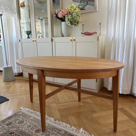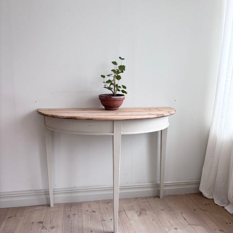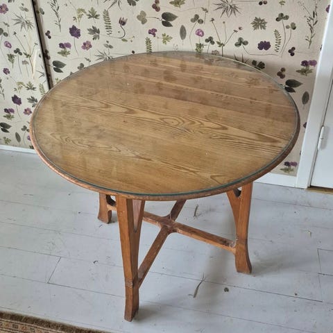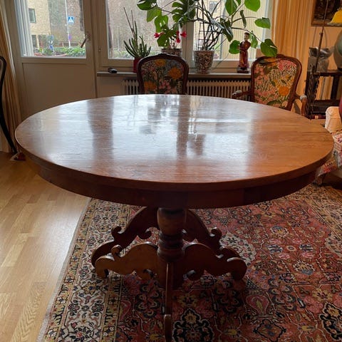 Fint runt träbord , gammalt. S k halvmånebord. Hjultrissor till varje ben finns om man vill sätta på.
