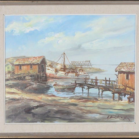 Thomas Färnqvist akvarellmålning med landskapsmotiv. Målningen föreställer ett öppet fält med hus och berg i bakgrunden. Signerad och daterad -82. Monterad med passepartout och inramad bakom glas.