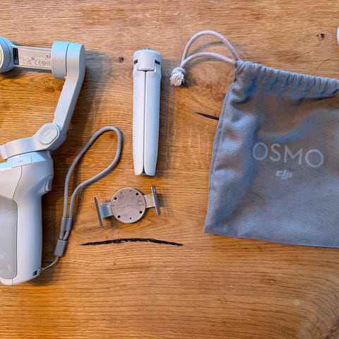DJI Osmo mobilgimbal i grå färg. Paketet på bilden inkluderar gimbal, förvaringspåse med DJI Osmo-, teleskopiskt handtag, kabel samt mindre tillbehör. Gimbalen är avsedd för stabilisering av mobilkamera vid foto och video och kan användas vid exempelvis vardagsfilmning, resor eller innehållsskapande där jämna och stabila klipp önskas.