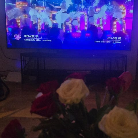TCL tv med platt skärm. Smart-tv med Google TV-gränssnitt enligt bilderna, lämplig för streaming av film, serier och appar. Står på en bänk med medföljande bordsstativ. Färg svart med tunn ram runt skärmen. Passar för vardagsrum eller sovrum där man vill ha en större bildyta för tv-tittande och spel. Exakta tumstorlek och modellbeteckning är inte angivna.