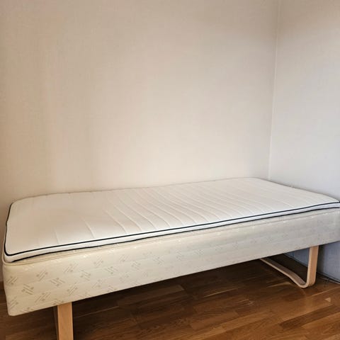 Mio säng med madrasser i vit färg. Sängen har huvudgavel och två separata madrasser som täcker hela liggytan. Passar som dubbelsäng i sovrum eller gästrum. Material är trä i sängramen med textilklädda madrasser.