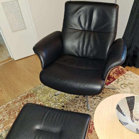 Stressless,Ekornes fåtölj Berlin Star. Inklusive fotpall. Svart läder. Inköpt 2023 för 18 000kr. Aktuellt nypris är 28 000.