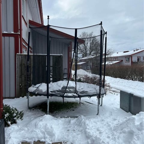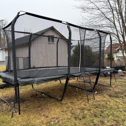 Oval studsmatta. Skyddsnät finns. Du flyger högt på denna mycket bättre än dåliga studsmattor från vanliga butiker.