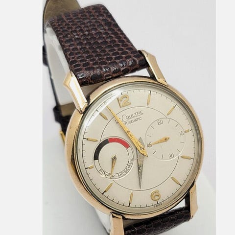 Vintage Jaeger-LeCoultre herrklocka med mekaniskt urverk med manuell uppvridning. visare och sekundvisare i mitten. Klockan kommer på ett nytt klassiskt brunt läderband med traditionellt JLC original spänne. Mekanismen är märkt Jaeger-LeCoultre Fab. Suisse / Swiss.