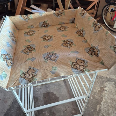 Skötbord brunlackerad stomme. Vitt plastat underlägg.