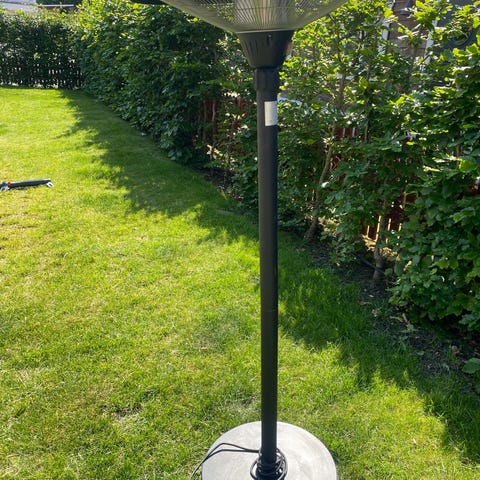Terrassvärmare i svart färg. Fristående modell med rund fot och justerbar höjd. Avsedd för användning utomhus, till exempel på altan, balkong eller uteplats. Utrustad med elsladd för anslutning till vägguttag och reflektorhuvud som riktar värmen mot sittplats eller arbetsyta.