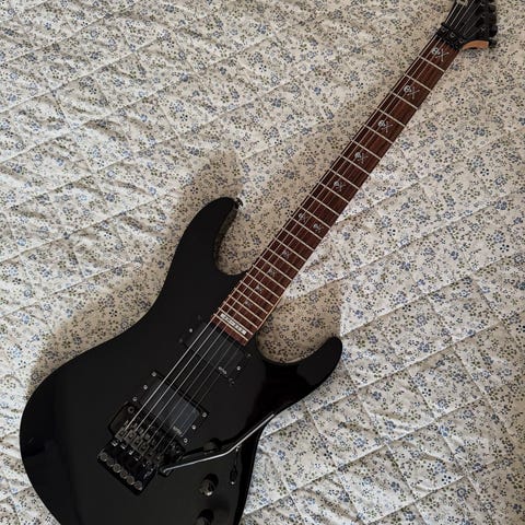 Signaturmodell åt Kirk Hammet av Esp i mycket fint skick. Denna variant är tillverkad i Indonesien och kommer med ett genuint Floyd Rose Special. Original Esp-mickar är utbytta mot ett klassiskt set JB/Jazz från Seymour Duncan. Jag har även bytt standard tonpot till en med push/pull funktion för att kunna splitta mickarna. Har i samband med det även justerat till vilken grad de splittas med hjälp av anpassad resistans. Så splitten blir mycket mer fyllig och lik riktiga singlecoils än vid traditionel, full split. Låter fenomenalt clean och mid gain i detta läge.
