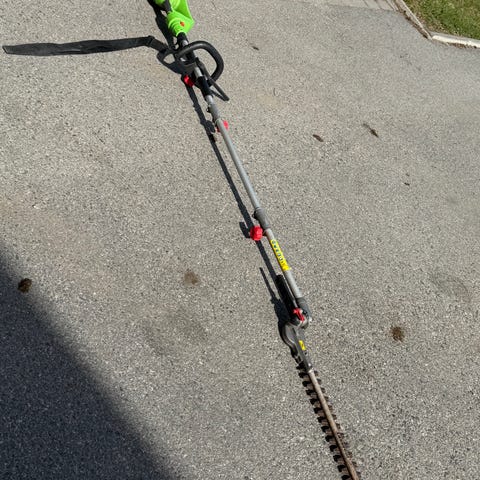 Eldriven häcksax i grön färg med tvåhandsfattning och skydd framför handtaget. Utrustad med tandad svärd-/knivdel för klippning av häckar och buskar. Passar för trädgårdsarbete där eluttag finns tillgängligt.
