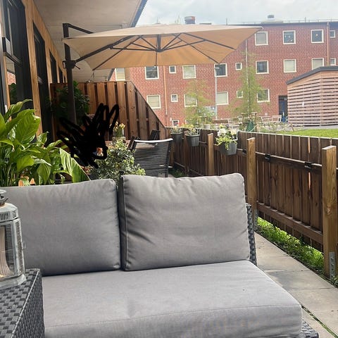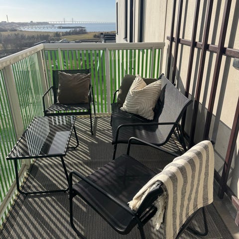 Trädgårdsgrupp balkongset med bord och stolar i svart. Setet består av ett rektangulärt bord med glasskiva och flera stolar med armstöd. Passar för användning på balkong, altan eller uteplats som sittgrupp för måltider eller avkoppling utomhus.