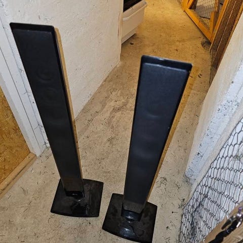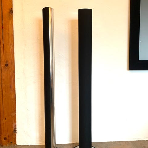 Bang & Olufsen golvhögtalare i svart utförande. Högtalarna står på runda basplattor och är utformade som pelare, anpassade för placering på golv. Passar för användning i vardagsrum eller andra rum där man önskar ett par fristående högtalare som kan kopplas till kompatibel ljudanläggning eller förstärkare från Bang & Olufsen eller annan utrustning med motsvarande anslutningar. Komplett med kablar och sladdar