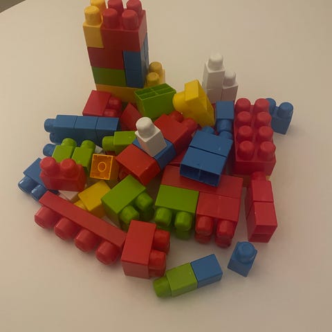 Lego Duplo motorcykel med figur i röd plast. Motorcykeln har svarta hjul och styre samt en avtagbar Duplo-figur med blå överdel och brunt hår. Passar ihop med andra Lego Duplo-klossar och set för lek med fordon och figurer.
