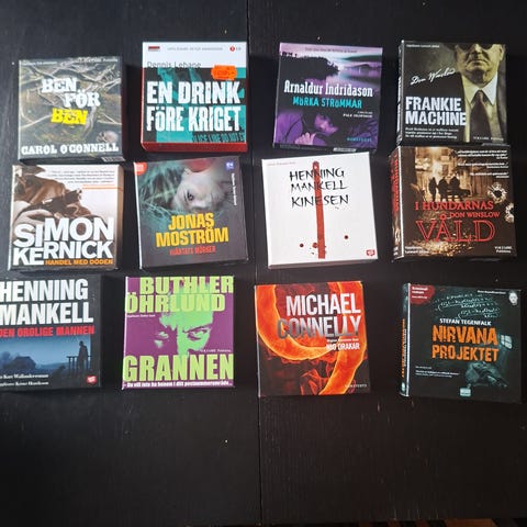 Samling med 39 ljudböcker på svenska av blandade författare. På bilderna syns bland annat titlar av Jan Guillou, Michael Connelly, Simon Scarrow, Liza Marklund, Åke Edwardson, Anne Holt, Lee Child, Jeffrey Archer med flera. Böckerna verkar vara i CD-format och omfattar främst deckare, thrillers, historiska romaner och biografier. Lämpliga för lyssning i bil, hemma eller på resa för den som vill ha en varierad samling ljudböcker på svenska.
