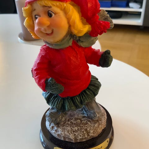 Dekorativ tomtefigur i rött och vitt med lång luva och hjärtmönster. Tomten håller i en svart lykta med stjärnor. Perfekt som juldekoration. Höjd ca 12 cm. Tillverkad i målad keramik.