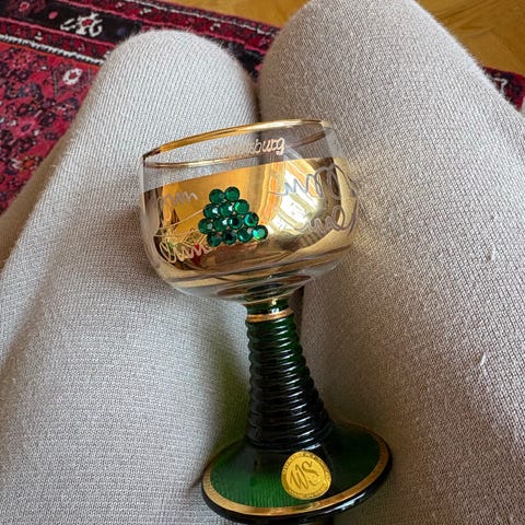 Remmare (Rhömare) med dekorativ grön fot och guldfärgad dekor på kupan. Glaset har en rund kupa med mönster i grönt och guld samt en profilerad fot i mörkgrönt glas. Passar för servering av exempelvis dessert, likör eller annan dryck, eller som prydnadsföremål. 13 st, 15 cm hög. Inköpta i Tyskland & inköpsställe står på glasen