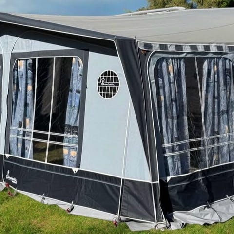 Måtten på tältet är cirka 390 cm i bredd och 250 cm i djup. Fronten har stora fönsterpartier med myggnät som ger ljusinsläpp och möjlighet till ventilation. Konstruktionen är avsedd att ge ett extra uterum vid husvagnen, lämpligt som sitt- eller matplats vid camping. Färgsättningen är i neutrala toner med ljus takduk och mörkare sidopartier.
