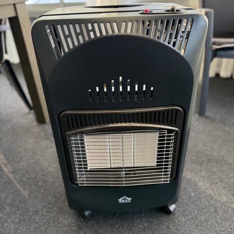 DAY infraröd gaskamin värmefläkt i grå färg. Fristående modell med frontgaller och inbyggd värmefläkt. Avsedd för gasolflaska som placeras inuti kaminen. Utrustad med reglage och säkerhetsanvisningar på ovansidan samt ventilationsöppningar upptill. Passar för uppvärmning av inomhusutrymmen där gasolvärme är tillåten och korrekt ventilation kan säkerställas. Exakta effekt- och tryckuppgifter framgår av typskylten på baksidan av kaminen. Hjul nedtill.