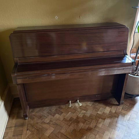 Akustiskt piano i brun träfaner. Pianot har klassisk, rak design med högglansig yta och rundade ben. Tangentlocket är helt och täcker hela klaviaturen. På ovansidan syns slitage och skador i faneret i ett hörn, vilket framgår av bilderna. Pianot lämpar sig för hemmabruk, övning eller som inredningsdetalj. Pall i matchande trä med ljus stoppad sits ingår enligt bild.