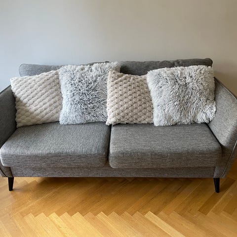 Fin tresitssoffa i gråblå sammetstyg. Väldigt skön att sitta i.