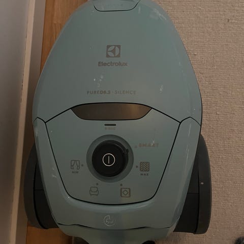 Kabelansluten torrdammsugare med behållare och hjul för enkel förflyttning. Modellen har bärhandtag upptill och sidofäste för elkabel. Passar för dammsugning av hårda golv och mattor i hem- eller kontorsmiljö. Använder dammsugarpåse (ej synlig på bild).