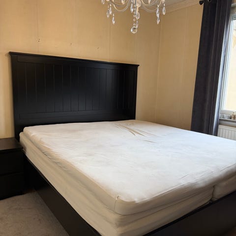 IKEA säng med hög gavlel i svart träutförande. Till sängen hör två matchande sängbord i svart med två lådor vardera. I rummet finns även en svart byrå med sex lådor samt en öppen garderob i svart med hyllor, klädstång och förvaringslådor. Möbelserien är enhetlig i färg och stil och passar som komplett sovrumsmöblemang. Taklampa från Sia.