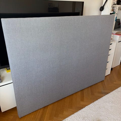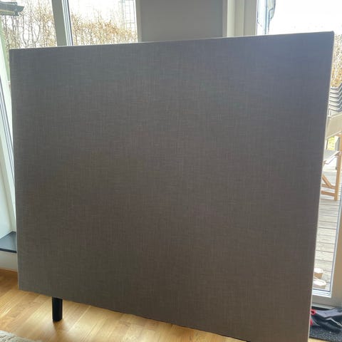 Carpe Diem Beds sänggavel klädd i grå textil. Gaveln står på ben och är avsedd att placeras bakom en säng mot vägg. Neutralt grått tyg som passar i de flesta sovrumsmiljöer. På ena sidan finns en mindre skada i tyget, vilket syns på bilden. Lämplig för användning som huvudgavel till säng. Exakta mått och modellbeteckning är inte angivna. 120x 120