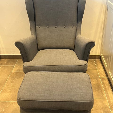 Bra skick.mindre fläckar. Fotpall till.44 bred 39 lång. Avtagbara ben.huvudkudde lös till.