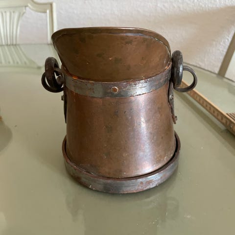 Koppar kittel med lock och finurligt lock på pipet dessutom en del historia i form av en kvitto från 1975. Mycket bra skick, gediget arbete, många fina detaljer.