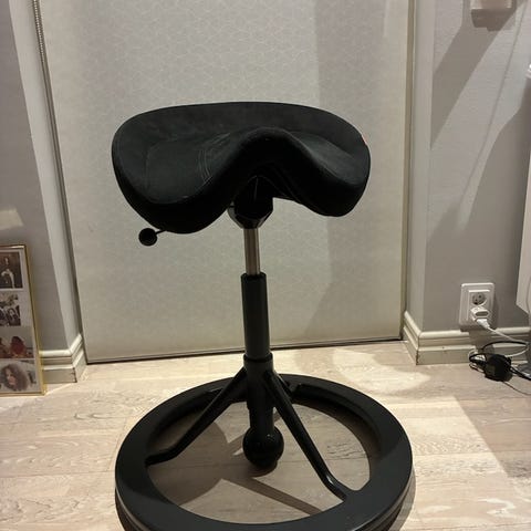 Kulan längst ner justerar du; ju mer den sticker ut desto mer kan man jobba med balansen då du sitter. Man kan även skruva in den helt och då fungerrar stolen som en vanlig sadelstol.