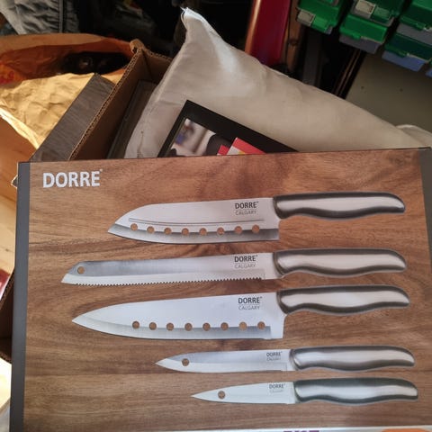 knivset med 8 st köksknivar i olika storlekar. Knivarna har svarta handtag och skyddande fodral över bladen. Setet lämpar sig för olika typer av matlagning och förberedelse i köket, till exempel skärning av grönsaker, kött och bröd.