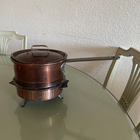 &Tradition gryta med lock i koppar. Grytan har två handtag i metall troligen mässing och ett lock med knopp. Insidan är ljus, troligen med annan metallbeläggning. På bilderna syns även en slev i koppar/ mässing som kan ingå tillsammans med grytan. Passar för matlagning eller servering . Diameter 17 cm, höjd 8,5 cm . passar utmärkt som tex. såsskål , vacker liten gryta, fröjd att titta på!