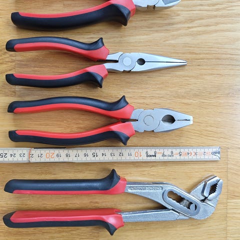 Rasp, håltagare, polygrip, skyddsglasögon, skruvmejslar, hovtång, skiftnyckel