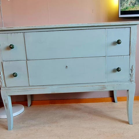 Äldre byrå målad delvis i vit färg.