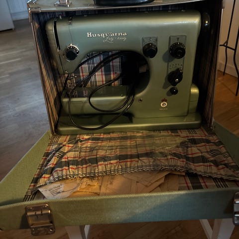 Husqvarna Zig-Zag symaskin i grön metall. Maskinen är elektrisk och utrustad med fotpedal. Den har zigzag- och raksöm enligt provsömmen på tyget. På sidan finns ratt för inställning av trådspänning samt reglage för stygnlängd och zigzagbredd. Maskinen levereras med hårt fodral och en mindre tillbehörslåda enligt bilderna. Passar för allmän sömnad och enklare lagning av kläder och hemtextilier.jätte stark symaskin syr kapell jeans skinn häst täcke mm