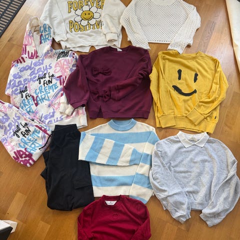 11 plagg i ett paket, stl.11-12år, 152, grått mys set, gul college, zebra college och Nirvana college från Zara, flerfärgad college från Molo, brun/vit rutig tröja, Stranger Things college, ljusbrun college, ljusrosa top och mörkglittrig top från HM.