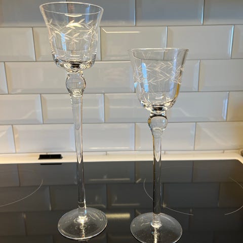 &Tradition ljusstakar i glas. Smala, höga modeller med rund fot och trattformad ljushållare upptill. Passar för exempelvis kronljus eller liknande smala ljus. Säljes som par och kan användas som dekoration på bord, hylla eller fönsterbräda. Höjd 41cm , tillverkad i Krosno berömt glasbruk i Polen.