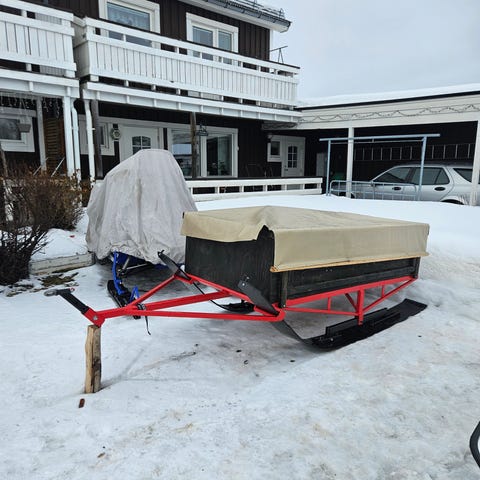 BRP Linq Carrier lastkälke. Oberoende fjädring. Går väldigt stabilt bakom skotern. Lastar 60 kg. Medföljer passande Thule takbox