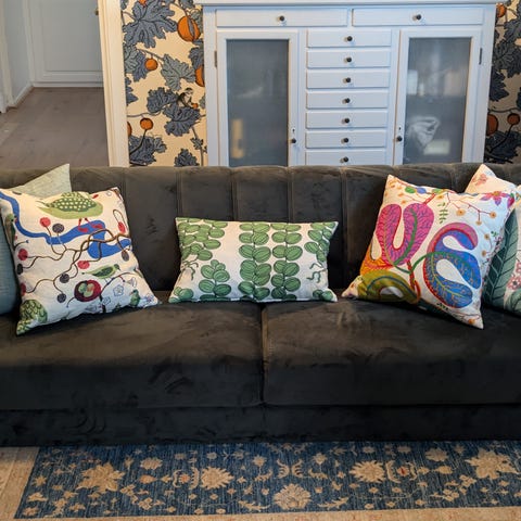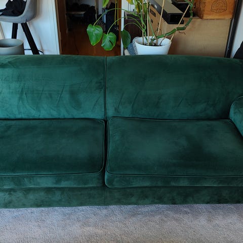 En högt älskad 3-sits soffa som jag haft i många år ska nu få hitta en ny ägare som kan uppskatta den. Tycker den är mer grön än bilderna visar. Den har fungerat utmärkt som sovplats när jag haft gäster. Har tvättat alla kuddar och fodral samt rengjort soffan så den ska vara i bästa skick till nästa ägare! Katt finns i hemmet men har inte fått vistas i den sen den tvättats.