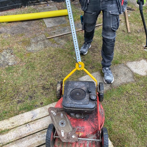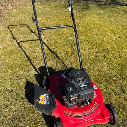 Bensindriven gräsklippare i röd färg. Modellen har fyra hjul och handtag för manövrering. Passar för klippning av gräsmatta i trädgård eller på tomt. Drivs med bensinmotor och har dragstart upptill på motorn. Uppsamlare saknas.