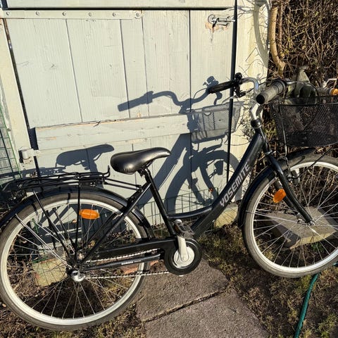 Handbroms fram och fotbroms bak. Belysning fram och bak.